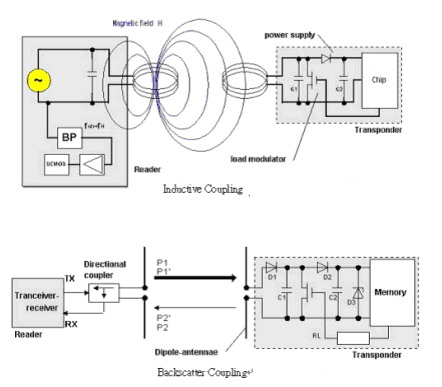 以RFID 卡片閱讀器及電子標(biāo)簽之間的通訊及能量感應(yīng)方式來(lái)看大致上可以分成, 感應(yīng)偶合(Inductive Coupling) 及后向散射偶合(Backscatter Coupling)兩種, 一般低頻的RFID大都采用第一種式, 而較高頻大多采用第二種方式。