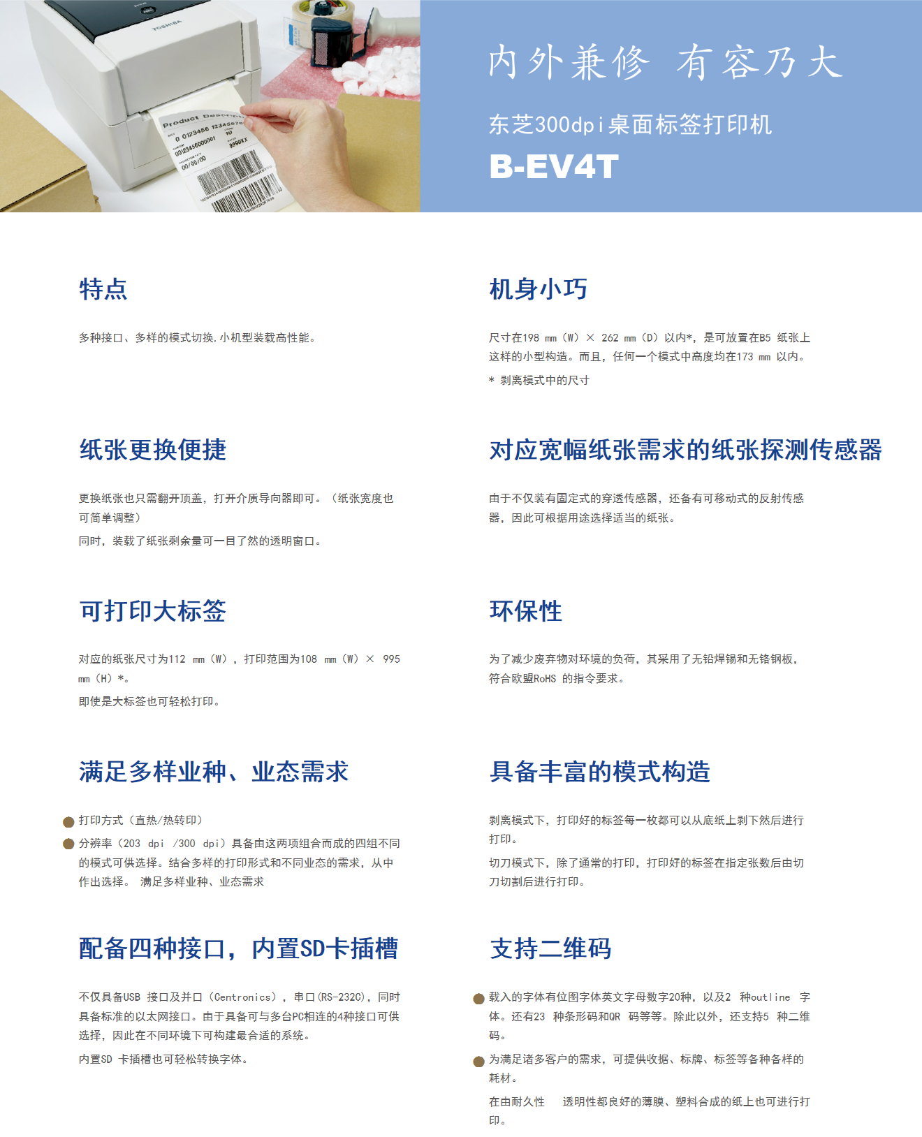 東芝B-EV4能夠直接、快速從您的PC桌面按需打印標(biāo)簽和票務(wù)信息,緊湊型專業(yè)標(biāo)簽打印功能,讓您在一個按鈕的觸碰下,便能輕松地生產(chǎn)專業(yè)標(biāo)簽。203 或300 dpi 打印分辨率機型同時,具備SD卡插槽擴展的功能,分辨率203dpi或300dpi能滿足多樣化的打印需求。