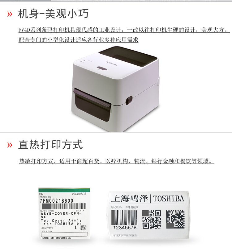 東芝B-FV4D系列出色的連接性、易用性和可維護性,配合各種打印速度和多種可選件,能滿足廣泛的行業(yè)應(yīng)用。小型化設(shè)計為您省出更多寶貴的桌面空間。東芝B-FV4D設(shè)計時尚精致,榮獲2015 iF產(chǎn)品設(shè)計大獎與良好的性能相得益彰。廣泛的應(yīng)用領(lǐng)域:制造業(yè) / 汽車業(yè) / 重工業(yè) / 鋼鐵業(yè) / 造紙業(yè) / 林業(yè) / 化工業(yè) / 制藥業(yè) / 紡織業(yè) / 零售業(yè) / 運輸與物流 聯(lián)系人:李先生 手機:1892