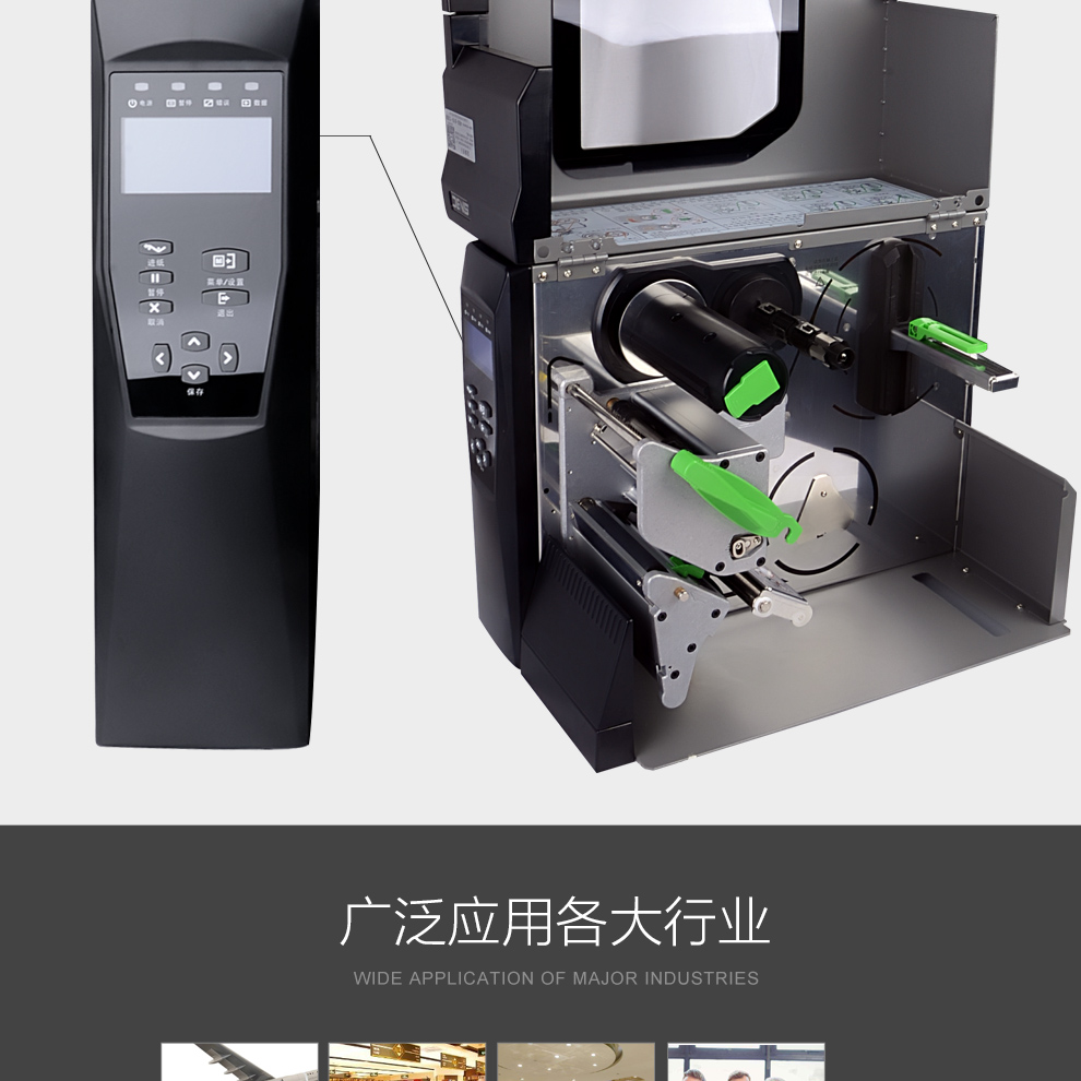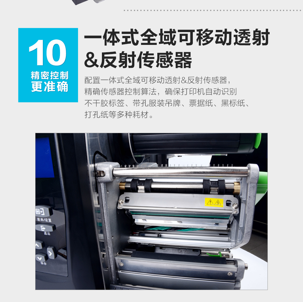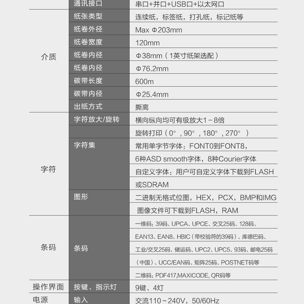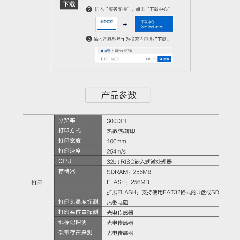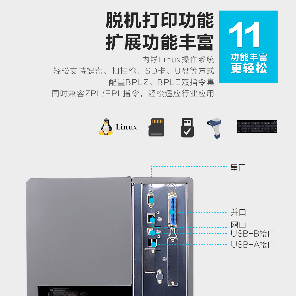 項目參數(shù)打印打印方式熱敏/熱轉印分辨率203DPI300DPI打印寬度104mm106mm打印速度305mm/s254mm/s處理器32位RSC處理器內存SDRAM:256MBFlash:256MB   擴展FLASH:支持使用FAT32格式的U盤或SD卡 通信接口標配:USB+串口+并口+以太網(wǎng)口選配:無線以太網(wǎng)口編輯語言BPLE、BPLZ探測紙?zhí)綔y傳感器透射傳感器