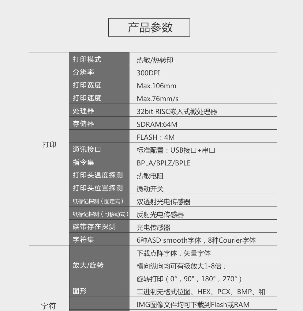 產(chǎn)品詳情打印參數(shù) ?  打印方式: 熱敏/熱轉(zhuǎn)印  ?  分辨率:12點(diǎn)/毫米(300 DPI) ?  打印寬度: 108 mm(Max.)  ?  打印速度: 76mm/s(300DPI) ?  存儲(chǔ)器: SRAM:2MB 主板FLASH:1MB  擴(kuò)展存儲(chǔ)卡FLASH: 8MB&nbs